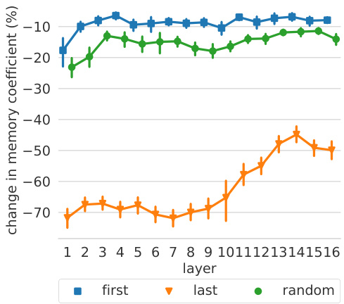 Figure 3: Relative change in memory coefficient caused by removing the first, the last, or a random token from the input.