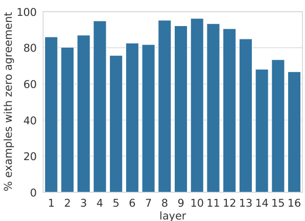 Figure 8: The fraction of examples in a random sample of 4,000 examples where the layer’s prediction is different from the prediction of all of its memories.