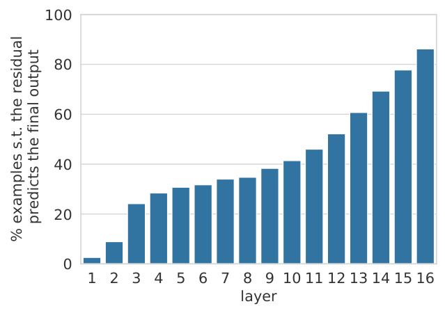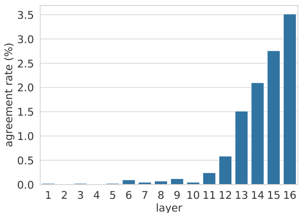 To test our hypothesis, we first measure how often the probability distribution induced by the residual vector $\mathbf{r}^{\ell}$ matches the model’s final output $\mathbf{o}^{L}$ ( $L$ being the total number of layers):