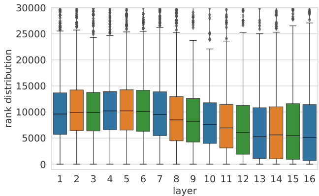 接下来,我们取出 $\mathbf{k}_ {i}^{\ell}$ 的 top-1 触发样本 $(w_{i}^{\ell})$ 的下一个 token,并查找它在值向量分布 $\mathbf{p}_ {i}^{\ell}$ 中的排名。图 5 显示,触发样本的下一个 token 的排名随着层数的增加而上升,这意味着 $w_{i}^{\ell}$ 在更高层中倾向于获得更高的概率。
