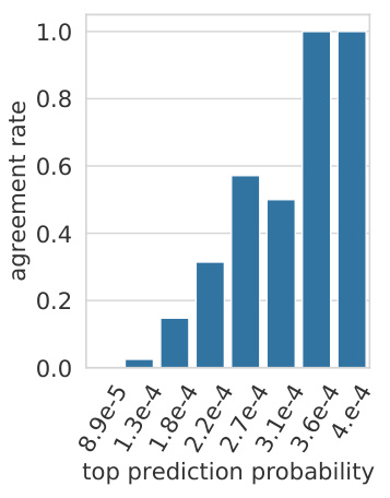 Figure 6: Agreement rate (between the top-ranked token based on the value vector   $\mathbf{v}_ {i}^{\ell}$   and the next token of the top-ranked trigger example associated with the key vector  $\mathbf{k}_{i}^{\ell}.$  ) as a function of the maximal probability assigned by the value vector.