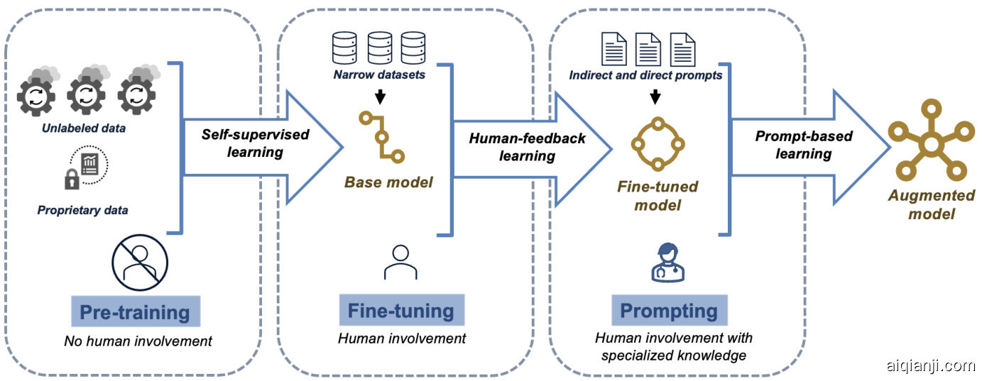 图 1: 大语言模型训练流程概览。模型在训练过程的每个阶段都会从更聚焦的输入中"学习"。第一阶段是预训练 (pre-training),大语言模型可以在无人监督的情况下,通过未标注数据和专有数据的混合进行训练。第二阶段是微调 (fine-tuning),此时会向基础模型输入更精细的数据集和人类反馈。经过微调的模型可进入附加阶段,由具备专业知识的人类通过提示工程 (prompting) 技术,将大语言模型增强为能够执行专业任务的模型。