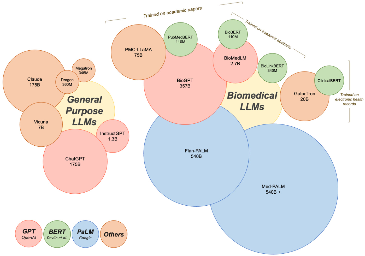 Figure 2. Current LLMs in medicine. Currently there are general purpose and biomedical LLMs used for medical tasks. While GPT by OpenAI, BERT by Devlin and colleagues, and PaLM by Google have led the development of LLMs with applications in medicine, other proprietary and open source LLMs also exist in this space. Circle sizes reflect the model size and the number of parameters used to build the models. LLMs with applications in medicine vary widely in how they were trained. BioMedLM 2.7B by GPT was trained on the corpus of PubMed articles and abstracts, for example, whereas Clinic alBERT was trained specifically on electronic health records. These differences in training and development can have important implications for how LLMs perform in certain medical scenarios.