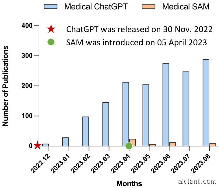 图 1: 医疗健康领域ChatGPT与SAM相关出版物数量统计。数据通过Google Scholar以"Medical ChatGPT"或"Medical Segment Anything"为关键词检索获得,最后更新日期为2023年8月31日。从4月到8月,每月关于ChatGPT在医学和医疗保健领域的出版物均超过200篇。