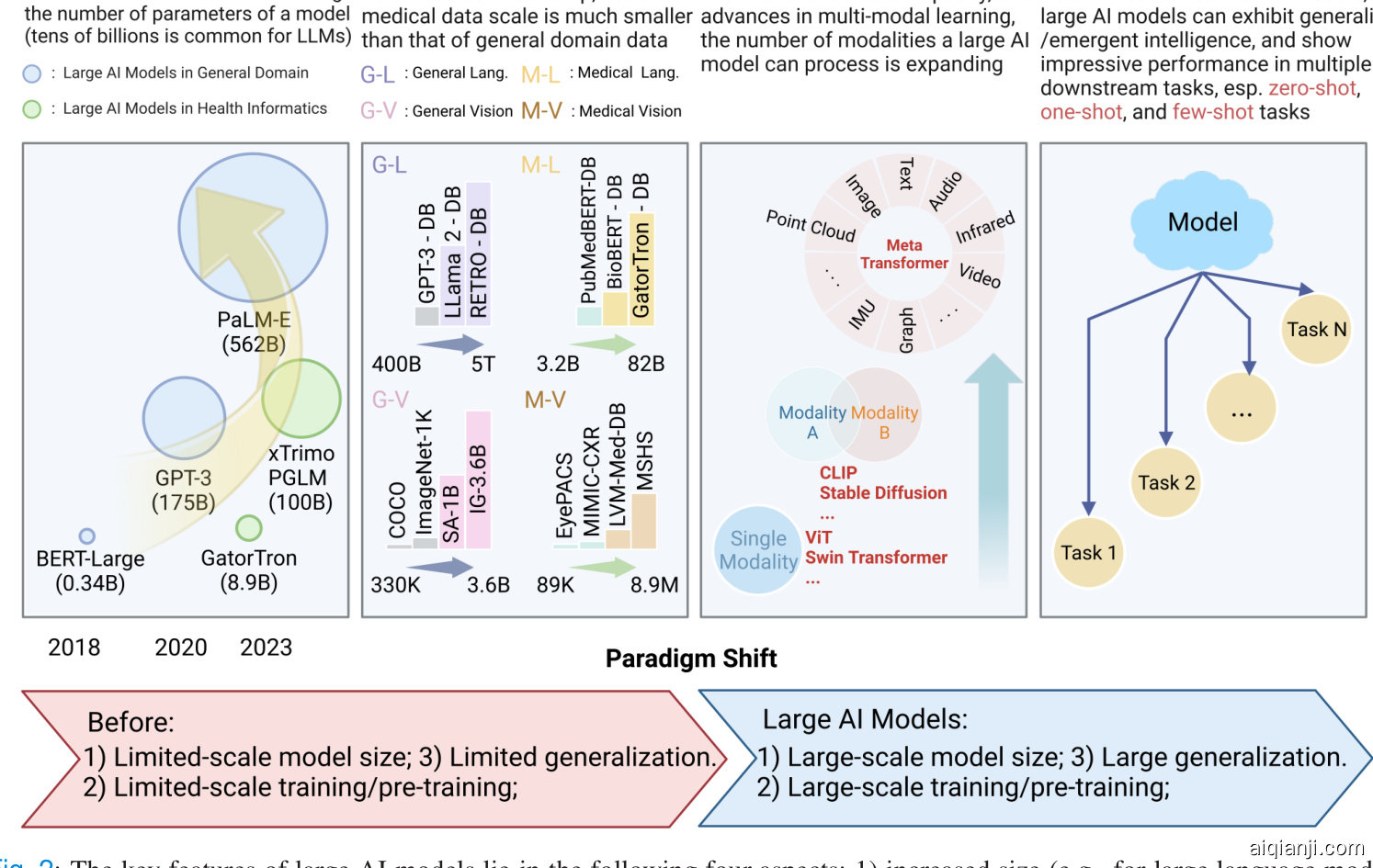 本文讨论的 LAMs 主要是基础模型 [7]。不过,本文也回顾了近期一些在当前阶段未必被视为基础、但对推动 LAMs 在生物医学和健康信息学领域未来发展具有开创性意义的 LAMs。图 2 总结了 LAMs 的关键特征,并强调了它带来的范式转变,即:1) 大规模模型尺寸;2) 大规模训练/预训练;3) 强泛化能力。
