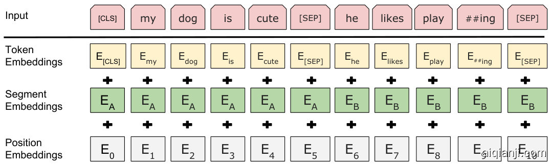 图 2: BERT输入表示。输入嵌入是token嵌入、分段嵌入和位置嵌入的总和。