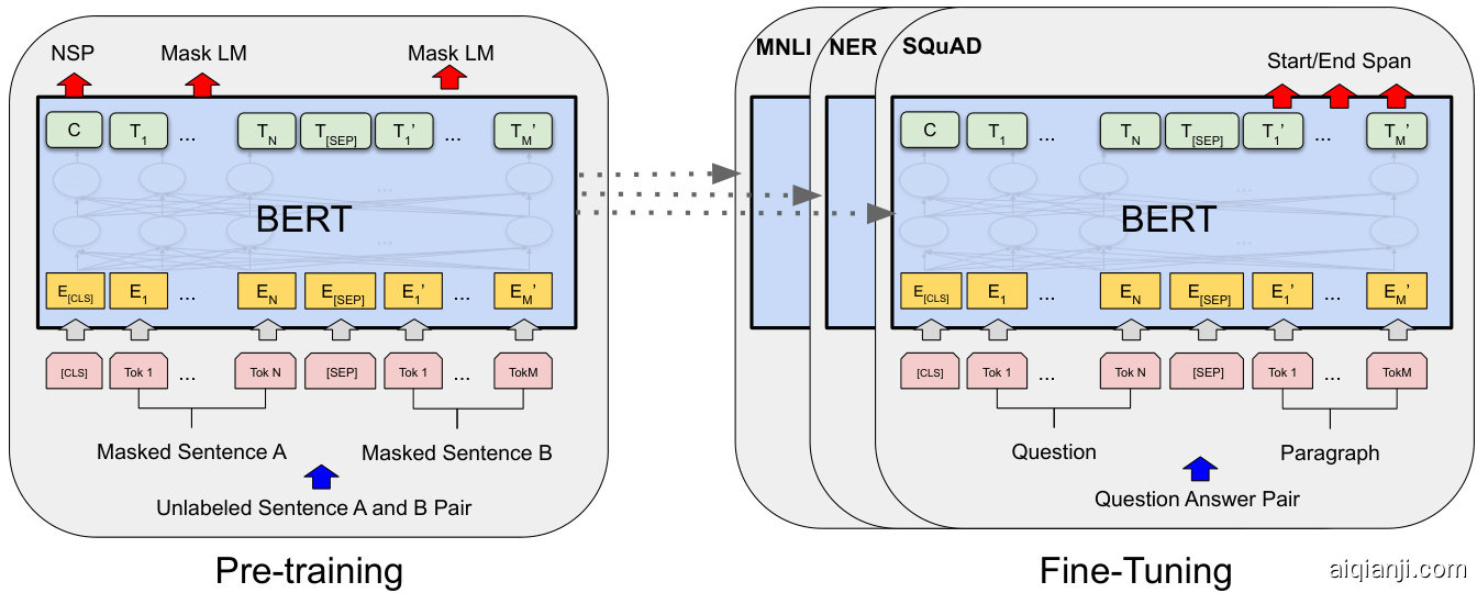 图 1: BERT的整体预训练与微调流程。除输出层外,预训练和微调阶段使用相同的架构结构。相同的预训练模型参数被用于初始化不同下游任务的模型。微调过程中所有参数都会被调整。[CLS]是添加在每个输入样本前的特殊符号,[SEP]是特殊分隔符token (例如分隔问题/答案)。