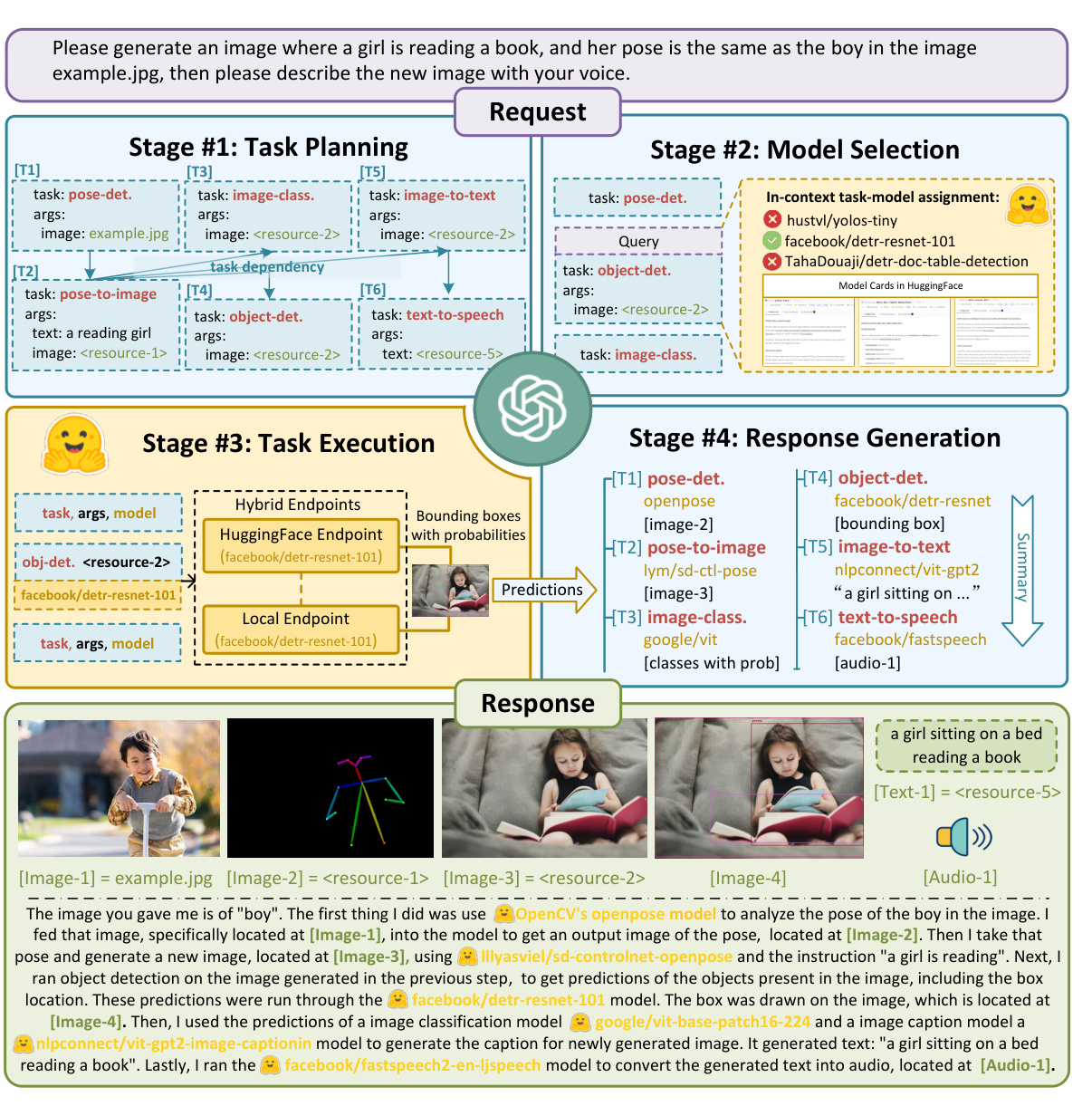 | #4 Response Generation Stage - With the input and the inference results, the AI assistant needs to describe the process and results. The previous stages can be formed as - User Input: {{ User Input 1, Task Planning: {{ Tasks }}, Model Selection: {{ Model Assignment ↓}, Task Execution: {{ Predictions ↓1. You must first answer the user's request in a straightforward manner. Then describe | ||