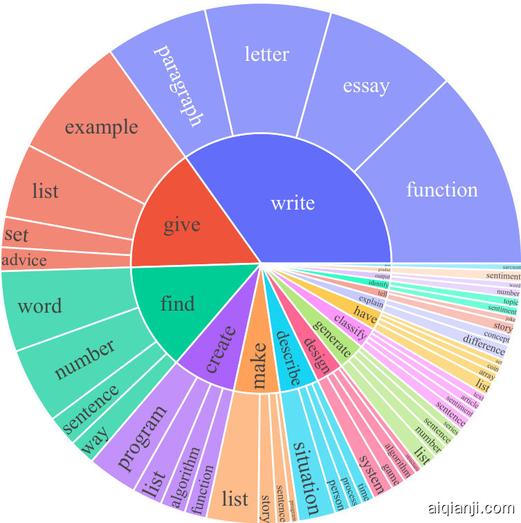 Figure 3: The top 20 most common root verbs (inner circle) and their top 4 direct noun objects (outer circle) in the generated instructions. Despite their diversity, the instructions shown here only account for  $14%$   of all the generated instructions because many instructions (e.g., “Classify whether the user is satisfied with the service.”) do not contain such a verb-noun structure.