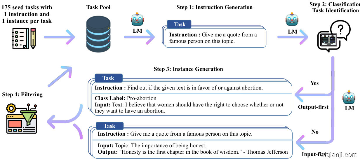 我们的数据生成流程包含四个步骤:1) 生成任务指令,2) 判断指令是否代表分类任务,3) 采用输入优先或输出优先的方法生成实例,4) 过滤低质量数据。