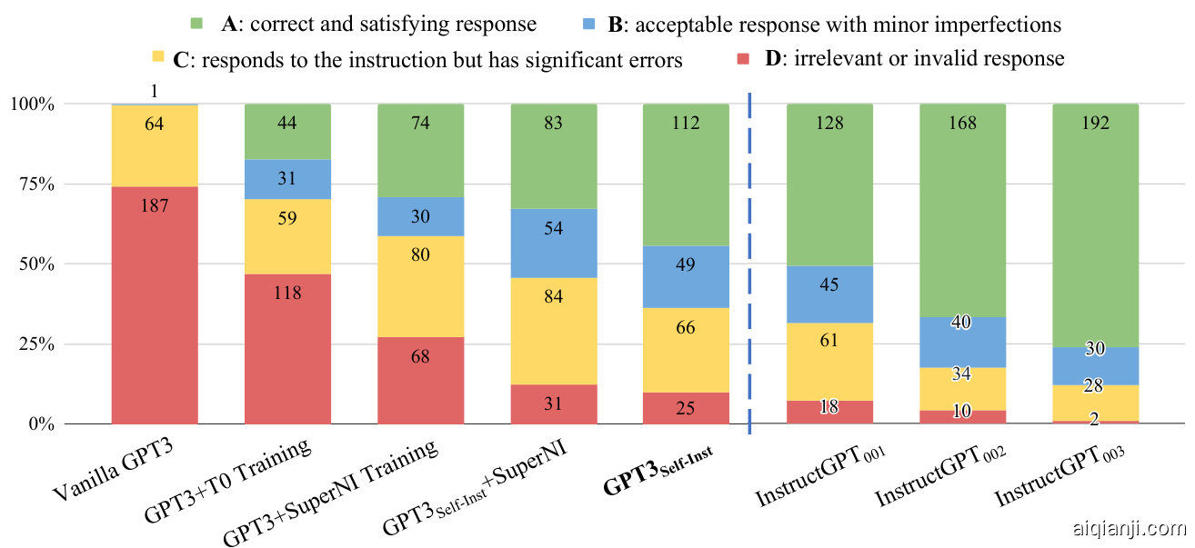 目前我们已展示了生成数据的数量和多样性,但其质量仍待验证。为此,我们随机抽取200条指令,每条指令随机选择1个实例,并邀请专业标注员(本文作者)从指令、实例输入和实例输出三个维度评估每个实例的正确性。表2的评估结果显示:大多数生成指令具有实际意义,而生成的实例可能包含更多噪声(在合理范围内)。但研究发现,即使生成内容存在错误,其中大部分仍保持正确格式或部分正确,这能为训练模型遵循指令提供有效指导。我们在表10和表11中分别列举了若干优质案例和问题案例。
