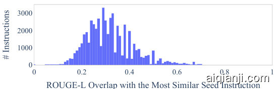为了评估模型在这些种子任务之外的泛化能力,我们进一步量化了种子任务指令与测试集指令的重叠程度,包括SUPERNI任务指令(第4.3节)和人工评估中面向用户的指令(第4.4节)。我们计算了每条种子指令与测试集中最相似指令之间的ROUGE-L相似度。图8展示了ROUGE-L分数的分布情况,其中种子指令与SUPERNI的平均ROUGE-L相似度为0.21,种子指令与面向用户指令的平均ROUGE-L相似度为0.34。可以看出,种子任务与