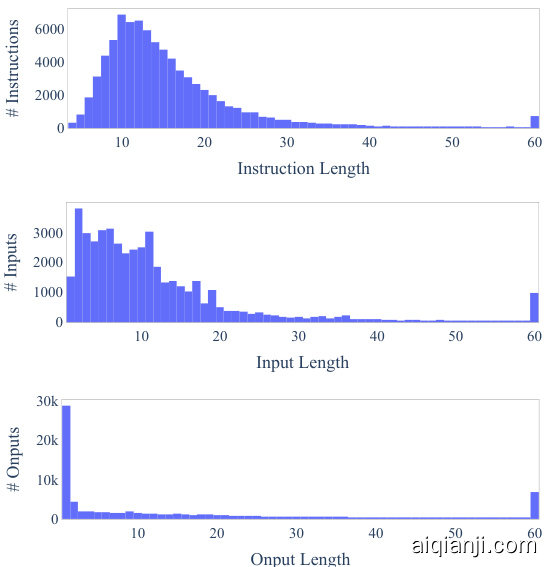 我们进一步研究了生成的指令与用于提示生成的种子指令之间的差异。对于每条生成的指令,我们计算其与175条种子指令的最高ROUGE-L重叠度,并在图4中绘制了这些ROUGE-L分数的分布。结果表明,生成了相当数量的新指令,这些指令与种子指令重叠度不高。图5还展示了指令长度、实例输入和实例输出方面的多样性。
