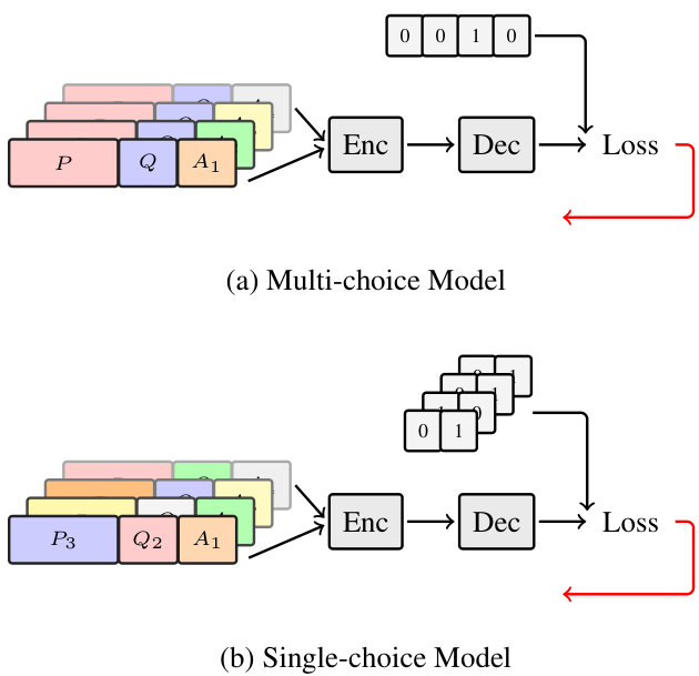 Alternatively, we reconstruct the multi-choice to single-choice. We just need to distinguish whether the answer is correct without considering other options in the candidate set. By this way, we keep the diversity in training batches and relax the constraints on multi-choice framework.