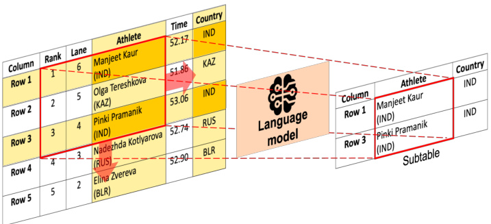 Question:Tell me the number of athletes from India. Figure 1. An overview of the proposed PieTa (Piece of Table) framework. Given an input table and a question, our algorithm synthesizes a sub-table for subsequent answering by iterative ly dividing the table into smaller windows, using language models to select relevant cells within these windows (thereby generating intermediate sub-tables), and merging these intermediate sub-tables. This process is repeated until the final sub-table is formed.