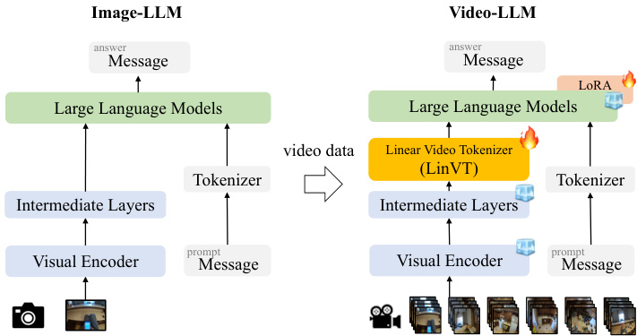 大语言模型 (LLM) 已被广泛应用于各种任务,这促使我们开发一款基于LLM的视频助手。我们并未选择从头训练,而是提出一个模块,可将任意训练成熟的图像大语言模型转化为视频大语言模型(需经过视频数据训练)。为更好地适配图像大语言模型处理视频,我们引入两项设计原则:通过线性变换保持原始视觉-语言对齐能力,以及从冗余视频内容中提炼代表性信息。基于这些原则,我们提出即插即用的线性视频分词器 (LinVT),使现有图像大语言模型具备视频理解能力。我们在Aquila、Blip-3、InternVL2、Mipha、Molmo和Qwen2-VL六个前沿视觉大语言模型上测试LinVT,证明了其高度兼容性。基于LinVT的大语言模型在多个视频基准测试中达到最先进性能,展现了LinVT在多模态视频理解中的有效性。代码已开源:https://github.com/gls0425/LinVT。