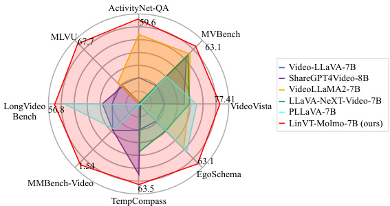 (b) Comparison between LinVT-Molmo-7B (ours) and other video-LLMs.