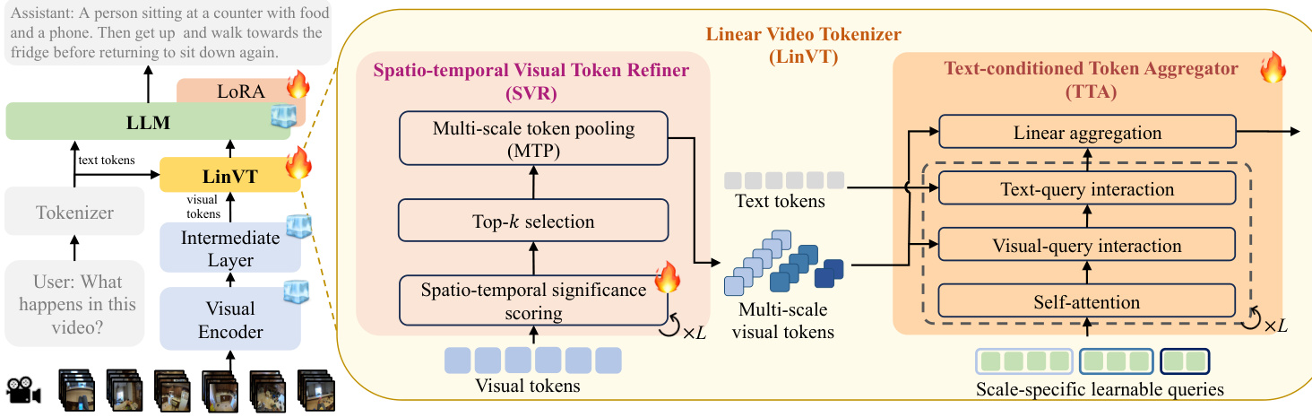 图 2: 基于LinVT的视频大语言模型框架。LinVT模块接收与视频单帧对应的视觉token及用户指令作为输入,随后生成紧凑且固定尺寸的视觉token。通过LinVT,图像大语言模型可轻松转换为视频大语言模型。首先,视觉token经过时空视觉token精炼器SVR(第3.2.1节)生成多尺度视觉token。这些多尺度视觉token随后被输入至文本条件token聚合器TTA(第3.2.2节)。最终,大语言模型结合用户指令与输出的视觉token,生成视频理解响应。所提出的LinVT以线性方式运行,能够保留图像大语言模型中的知识。
