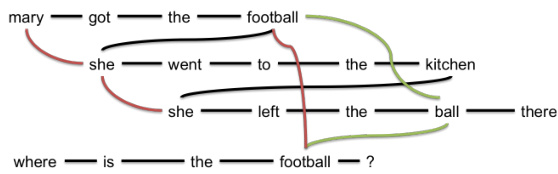 Story Based QA: Our first benchmark is the bAbi dataset from Weston et al. (2015), a set of 20 toy tasks aimed at measuring the ability of agents to reason about natural language. In each task the agent is presented with a simple story about entities in operating in an environment, followed by a question about the final state of that environment. Different tasks measure different reasoning abilities on the part of the agent, including chaining facts, counting, deduction, induction and others. An example2 is shown in Figure 3. The official release of the dataset3 comes with two versions, we focus on the more difficult 1K split in this work. Following Seo et al. (2017b), we ran 10 random initi aliz at ions of the model and report the test set performance for the model with the best validation set performance.