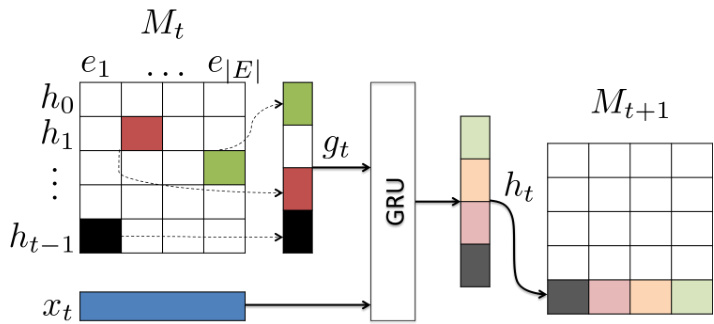 Miller et al. (2016) and Daniluk et al. (2017) argue that overloaded use of state representations as both memory content and address makes training of the network difficult, and decompose these two functions by parameter izing them separately. Similarly, we decompose the hidden states in the GRUs and maintain a separate hidden state vector $h_{t}^{e}\in\mathbb{R}^{d_{e}}$ for each edge type in $\mathcal{E}_{f}$ . The intuition behind this is that, for example, the representation flowing through the black edges in Figure 1 need not be the same as that flowing through the red or green edges.