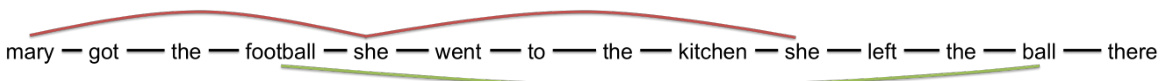Figure 1. A sequence of text augmented with extra links. Red edges denote co reference relations, and green edges denote hypo/hypernymy. Black edges denote usual sequential links.