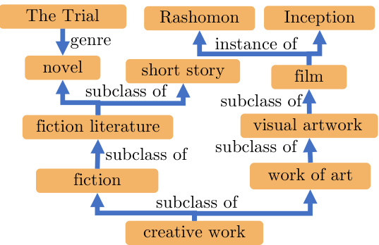 The KB relations we annotated occur between the entities linked in Wikidata, and they do not capture hierarchical multihop relations between the entities in the KB. We create such a hierarchy by combining the “instance of”, “part of”, and “subclass of” relations in Wikidata. Thus, a pair of entities connected via a directed path of length $k\leqslant3$ , such as “Work of art” and “Rashomon” in Figure 5, is considered to have a parent-child relation, and assigned the forward or reverse entailment NatOp, depending on which span appears in the claim and the evidence. Similarly, two entities, e.g. “Rashomon” and “Inception”, are considered to be siblings if they have a common parent, and are assigned the alternation NatOp (ê). However, two connected entities that do not satisfy the aforementioned distance criterion, e.g. “novel” and “Rashomon”, are assigned with the independence NatOp (#), signifying they are unrelated.