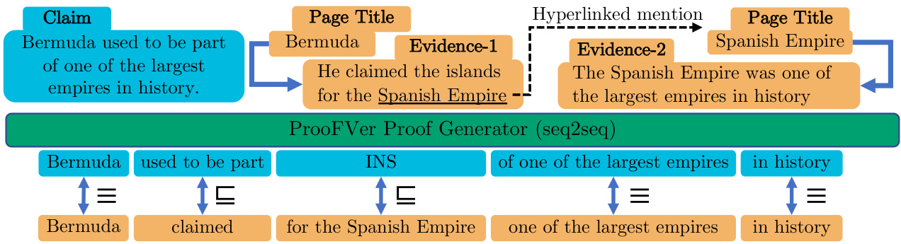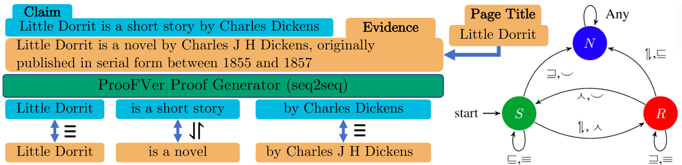 与其他自然逻辑系统 (Angeli et al., 2016; Feng et al., 2020) 不同,ProoFVer 能够通过利用连接多个证据句子的实体提及,将这些句子中的片段组合起来形成证明。该证明由一个基于启发式标注数据集训练的序列到序列 (seq2seq) 模型生成,该数据集通过结合公开可用的 FEVER 数据集 (Thorne et al., 2018a; Thorne and Vlachos, 2021b)、PPDB (Pavlick et al., 2015)、Wordnet (Miller, 1995) 和 Wikidata (Vrandecic and Krötzsch, 2014) 的信息构建而成。我们采用启发式方法为三个数据集中的声明生成训练数据,这三个数据集分别是 FEVER、对称 FEVER (Schuster et al., 2019) 和 FEVER 2.0 (Thorne et al., 2019)。