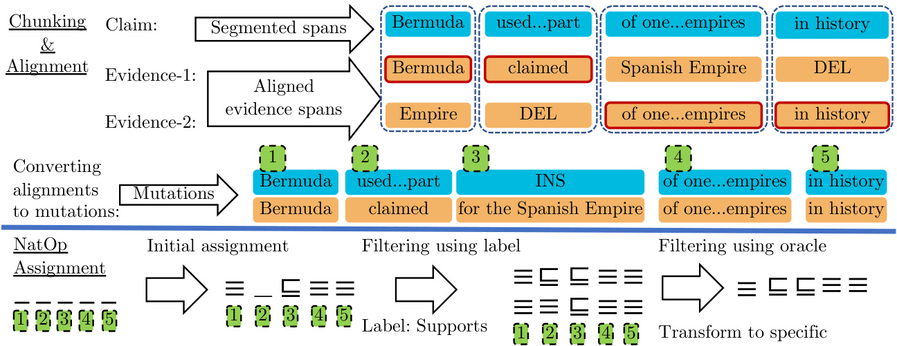 基于证据的事实核查训练数据集由包含声明、真实性标签及证据(通常为一组句子)的实例构成 [20][21][22]。然而,为训练第3.1节的证明生成器,我们需要三元组序列。手动标注这些数据将极其耗时,因此我们采用启发式方法从现有资源中生成。如图4所示,我们执行两步标注流程:分块与对齐,随后进行NatOp分配。