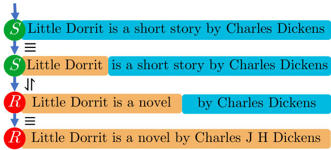 2014)。证明中的一个步骤可以用一个三元组表示,该三元组由突变中的对齐片段及其分配的NatOp组成。在此示例中,第一个和最后一个三元组中的突变发生在语义等效的片段上,因此被分配了等价NatOp $(\equiv)$。然而,第二个三元组中的突变导致了矛盾,因为"short story"被替换为"novel",而一个项目不能同时是两者。因此,该突变被分配了交替NatOp (ê)。证明中的NatOp序列成为图1中DFA的转换,在这种情况下终止于"REFUTE (R)"状态,即证据反驳了该主张。
