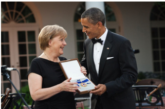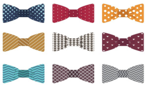 图 1: 一位政客收到来自一位背景为白色、佩戴多色领带拼贴画的政客的礼物。