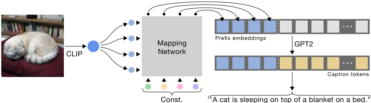 图 2 展示了我们的方法示意图。我们采用 GPT-2 (large) 作为语言模型,并利用其分词器 (tokenizer) 将描述文本映射为嵌入向量序列。为了从图像 $x^{i}$ 中提取视觉信息,我们使用了预训练 CLIP [29] 模型的视觉编码器。随后,通过一个轻量级映射网络 $F$ 将 CLIP 嵌入向量映射为 $k$ 个嵌入向量:
