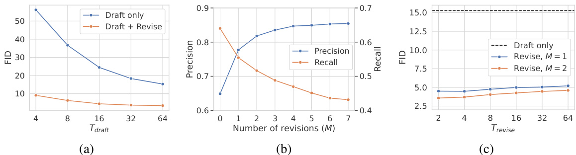 Figure 4: Ablation study on Draft-and-Revise decoding in Section 4.4. (a) FID subject to  $T_{\mathrm{draft}}$  . (b) Precision and recall subject to  $M$  . (c) FID subject to  $T_{\mathrm{revise}}$  .