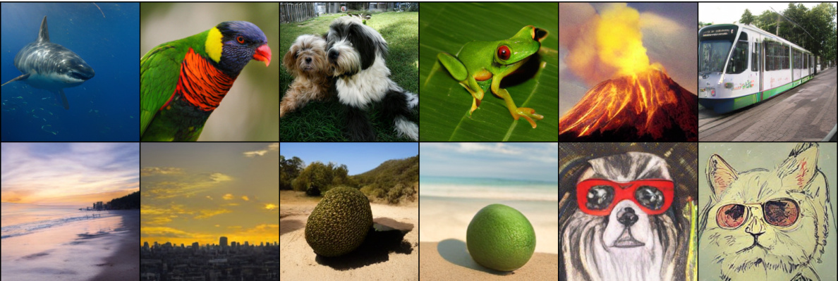 图 3: 我们的模型在 (上) ImageNet 和 (下) CC-3M 数据集上训练后生成的 $256\times256$ 图像示例。使用的文本条件为 "Sunset over the skyline of a {beach, city}.", "an avocado {in the desert, on the seashore}.", 以及 "a painting of a {dog, cat} with sunglasses."。