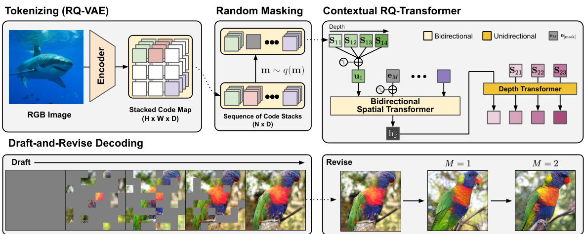 图 2: 基于上下文 RQ-Transformer 的起草-修订框架概览。该框架利用图像的全局上下文生成内容多样化的高质量图像。