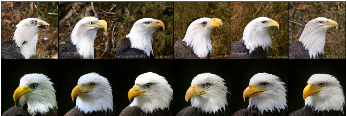 Figure 5: Examples of generated images in the draft phase (left) and revise phases at  $M=1,2,3,4,5$  . The draft images are generated with  $T_{\mathrm{draft}}=8$   (top) and  $T_{\mathrm{draft}}=64$   (bottom), respectively.