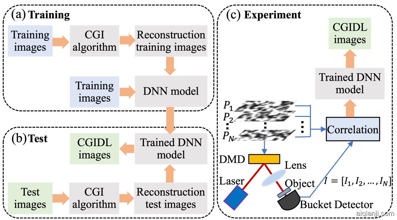 图 2: CGIDL的流程图包含三部分: (a) 训练, (b) 测试, (c) 实验。深度神经网络(DNN)模型通过仿真使用数据库中的CGI结果进行训练。仿真测试过程和实验测量同时使用手写数字和方块风格数字。CGI实验部分采用粉红噪声和白噪声散斑图案, 其CGI结果通过训练好的DNN模型进行优化。