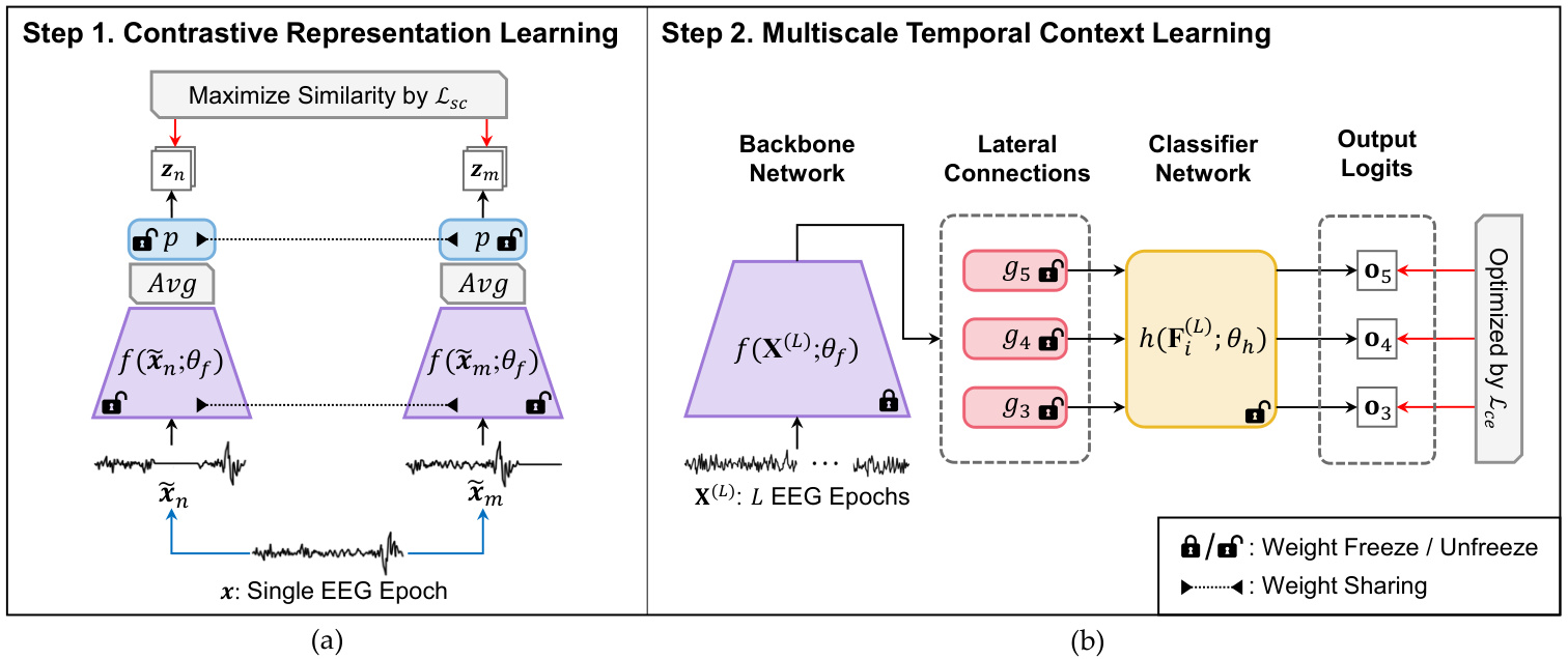 如图 2 所示,我们的学习框架包含两个训练步骤。第一步通过对比表示学习 (contrastive representation learning, CRL) ,采用对比学习策略对主干网络 $f(\cdot)$ 进行预训练。在此步骤中,主干网络 $f(\cdot)$ 基于监督对比损失 [43] 学习提取类别判别特征。第二步通过多尺度时序上下文学习 (multiscale temporal context learning, MTCL) 在特征金字塔中学习序列关系。为此,我们从 CRL 中获取 $f(\cdot)$ 的已学习权重并冻结它们以保留类别判别特征。网络的其余部分 $(g(\cdot)$ 和 $h(\cdot))$ 则通过预测目标时相的睡眠阶段来学习多尺度时序上下文。