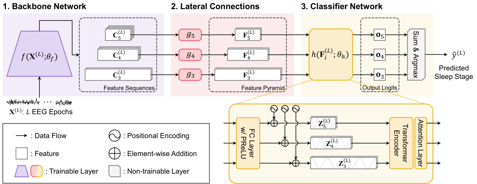 The proposed SleePyCo model comprises three major components: backbone network, lateral connections, and classifier network. The backbone network extracts feature sequences from raw EEG signals with multiple temporal scales and feature dimensions (number of channels). Thus, we designed a shallow network based on previous studies because they achieved state-of-the-art performance [7], [23], [25]. The lateral connections transform feature sequences with different feature dimensions into the same feature dimension via a single convolutional layer, resulting in a feature pyramid. For the classifier, a transformer encoder is employed to capture the sequential relations of EEG patterns on different temporal and frequency scales at subepoch levels.