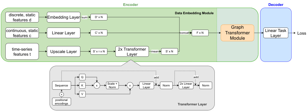 Data embedding module: Following the conventional Graphormer [25], we process discrete input features by an embedding layer, followed by a summation over the feature dimension, resulting in embedded features $\mathbf{d}{\mathbf{i}}^{\prime}\in\mathbb{R}^{D^{\prime}}$ , where $D^{\prime}$ is the output feature dimension. While Graphormer is limited to static, discrete input features only, we improve upon Graphormer to support also static, continuous input features, which are processed by a linear layer resulting in the embedding vector $\mathbf{c_{i}^{\prime}}\in\mathbb{R}^{C^{\prime}}$ . The third branch of our data embedding module handles timeseries input features $\mathbf{t_{i}}\in\mathbb{R}^{S\times\tau}$ with a linear layer, followed by two transformer layers to deal with variable sequence lengths and allow the model to incorporate temporal context. The output is given by $\mathbf{t}{\mathbf{i},\mathbf{h}}^{\prime}\in\mathbb{R}^{E}$ per time-step h. The mean of these embeddings forms the final time-series embeddings $\mathbf{t}{\mathbf{i}}^{\prime}\in\mathbb{R}^{S^{\prime}}$ . The feature vectors $\mathbf{d_{i}^{\prime},c_{i}^{\prime}}$ and $\mathbf{t_{i}^{\prime}}$ are concatenated to form the final node embeddings $n_{i}\in\mathbb{R}^{F}$ , where $\begin{array}{r}{\boldsymbol{F}=\sum_{F_{k}\subset[D^{\prime},C^{\prime},S^{\prime}]}F_{k}}\end{array}$ , for each of the $N$ nodes.