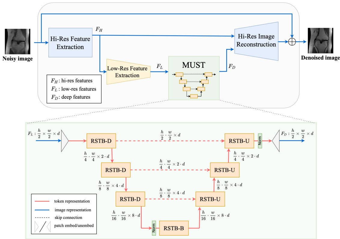 The key component to our architecture is MUST, a multi-scale hybrid encoder-decoder architecture that performs deep feature extraction in both image and token representation (Figure 1, bottom). First, individual pixels of the input representation of shape $\textstyle{\frac{h}{2}}\times{\frac{w}{2}}\times d$ are flattened and passed through a learned linear mapping to yield $ \frac{h}{2}\cdot\frac{w}{2}$ tokens of dimension $d$ . Tokens corresponding to different image patches are subsequently merged in the encoder path, resulting in a concise latent representation. This highly descriptive representation is passed through a bottleneck block and progressively expanded by combining tokens from the encoder path via skip connections. The final output is rearranged to match the exact shape of the input low-resolution features $F_{L}$ , yielding a deep feature representation $F_{D}$ .