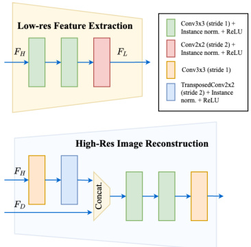 High-resolution Image Reconstruction– Finally, we combine information from shallow, high-resolution features $F_{H}$ and deep, low-resolution features $F_{D}$ to reconstruct the high-resolution residual image via a convolutional reconstruction module $f_{R}$ . The residual learning paradigm allows us to learn the difference between noisy and clean images and helps information flow within the network [He et al., 2015]. Thus the final denoised image $\pmb{x_{o u t}}\in\mathbb{R}^{h\times w\times c_{i n}}$ is obtained as ${\pmb x}{o u t}={\pmb x}{i n}+f_{R}(F_{H},F_{D})$ . The specific architecture of the reconstruction network is depicted in Figure 4.
