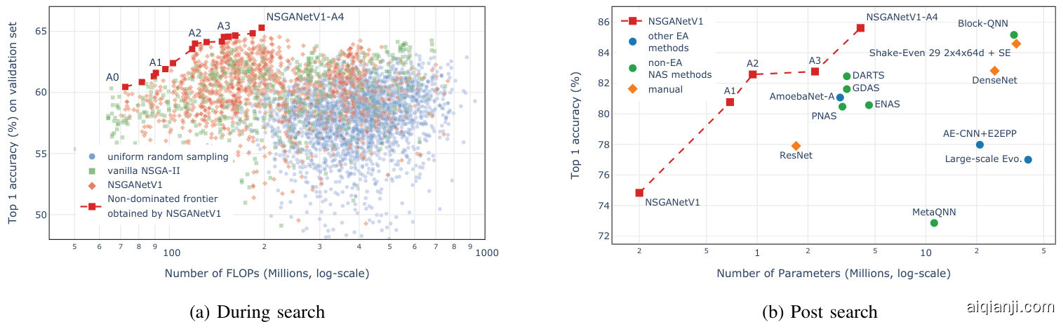 - 通过单次运行获得一组架构,NSGANetV1允许设计者在搜索后选择合适网络,而非预先定义目标偏好权重。对非支配架构集的进一步后优化分析常能揭示宝贵设计原则,这也是将NAS (Neural Architecture Search) 构建为多目标优化问题的另一优势,如NSGANetV1所示。
