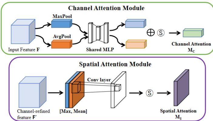 FIGURE 2. Diagram of each attention sub-module [27]: CBAM consists of two independent submodules the part in the green box is the channel attention module (CAM), the purple box is the spatial attention module (SAM), and  $\textcircled{5}$  denotes the sigmoid function.