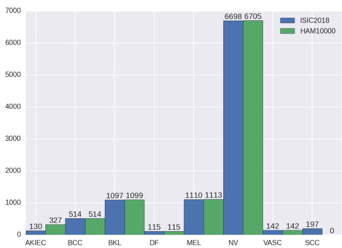 FIGURE 1. Sample distribution and comparison of different skin lesion images in ISIC2018 and HAM10000. The task3 of ISIC2018 included training data(HAM10000), validation data and test data. They are all organized into seven types of skin lesions. Zhao et al. added some images of squamous cell carcinoma(SCC) to ISIC2018 and deleted some samples, so that the distribution of ISIC2018 dataset is similar to that of ISIC2019 dataset. More details of the HAM10000 dataset are shown in the ‘‘DATASET’’ subsection.