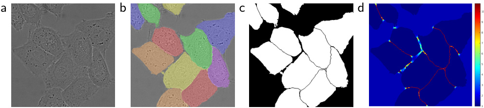 图 3: 使用DIC (微分干涉差) 显微镜记录的玻璃上的HeLa细胞。(a) 原始图像。(b) 与真实分割叠加的效果图。不同颜色表示不同的HeLa细胞实例。(c) 生成的分割掩码 (白色: 前景, 黑色: 背景)。(d) 带有逐像素损失权重的映射图, 用于强制网络学习边界像素。