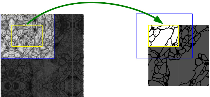 Fig. 2. Overlap-tile strategy for seamless segmentation of arbitrary large images (here segmentation of neuronal structures in EM stacks). Prediction of the segmentation in the yellow area, requires image data within the blue area as input. Missing input data is extrapolated by mirroring