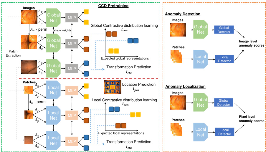 本文提出了一种专门从正常训练图像中学习正态信息的自监督表示学习方法——约束对比分布学习 (CCD)。CCD的核心贡献包括:a) 对比分布学习,b) 两个专为异常检测 (AD) 设计的预训练约束。不同于现代自监督学习 (SSL) [6,17] 致力于学习通用语义表示以支持多样下游任务,CCD通过对比强增强图像 (如随机排列) 的分布进行学习。由于强增强图像与某些异常图像相似,CCD的对比分布学习机制迫使模型学习具有判别力的正态表示。新增的增强预测和位置预测两个预训练约束,则用于学习细粒度正态表示以检测细微异常。这两个独特组件显著提升了面向异常检测的自监督表示学习效果,大幅超越先前通用型SOTA SSL方法 [2,6,13,18]。CCD的另一重要贡献是其与下游异常分类器的无关性。实验证明CCD能提升三种不同异常检测器 (f-anogan [37], IGD [8], MS-SSIM [48]) 的性能。受IGD [8] 启发,我们分别在全图与局部图像块上实施CCD预训练。在结肠镜图像 (来自两个数据集 [4,27]) 和青光眼检测眼底图像 [21] 这三个医疗筛查基准上的大量实验表明,该方法能在医学图像中实现SOTA级别的异常检测与定位。