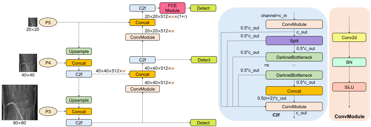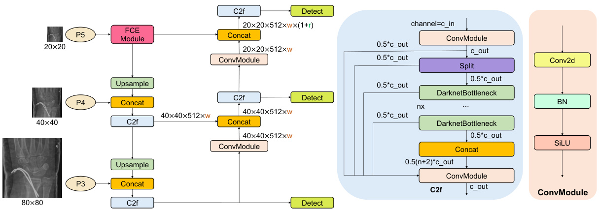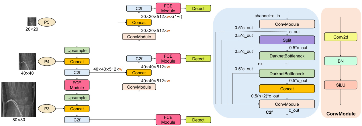 The rest of this paper is organized as follows: Section 2 reviews previous research on pediatric wrist fracture detection based on YOLO models. Section 3 introduces FCE-YOLOv8 model architectures on three different improved methods, and FCE modules used in this work. Section 4 presents the experiment conducted to evaluate the most efficient model architecture method for FCE-YOLOv8 models, and compares our proposed models with other SOTA models. Section 5 discusses the limitations of this work, particularly the class imbalance in the used dataset. Finally, Section 6 summaries the outcomes of this paper and suggests directions for future work.