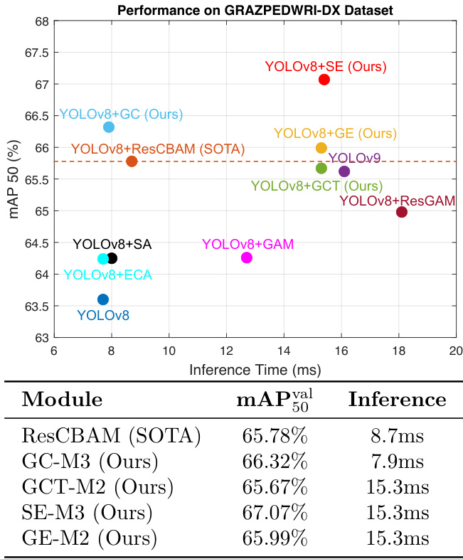 This work proposes FCE-YOLOv8 models, incorporating SE [9], GC [3], GE [8], and GCT [19] modules into YOLOv8, respectively, to enhance the model performance, and the results are shown in Fig. 1. This paper makes the following contributions: 1) Introduces four different FCE modules to YOLOv8 model architecture, demonstrating significant improvements in model performance for pediatric wrist fracture detection. 2) Evaluates the most efficient model architecture method for each variant of the FCE-YOLOv8 models. 3) Our proposed $\mathbf{YOLO}\mathbf{+GC}$ model achieves the second-best performance on mAP $\bf@50$ value on the GRAZPEDWRI-DX public dataset with only a slight increase in inference time.