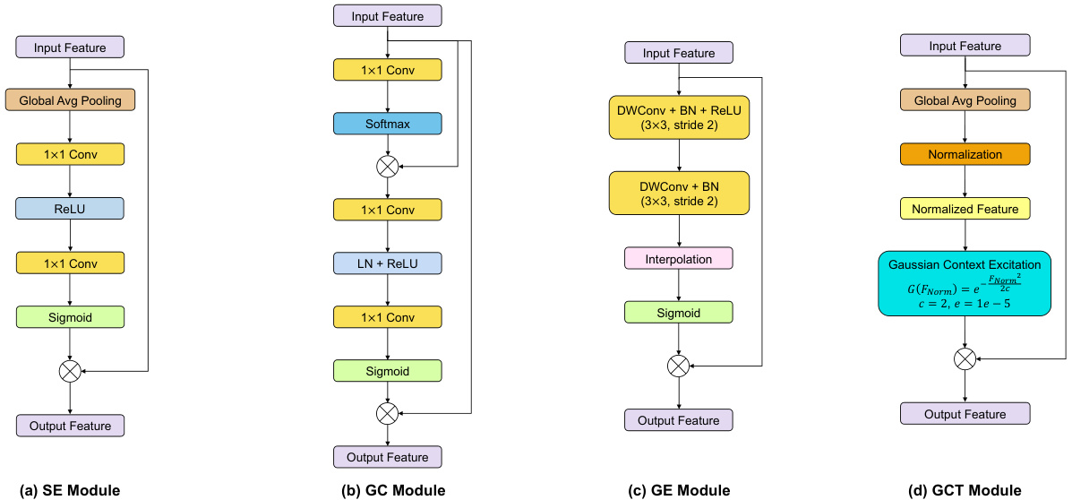 图 5: 提出的FCE模块示意图: (a) SE模块, (b) GC模块, (c) GE模块, 以及 (d) GCT模块。